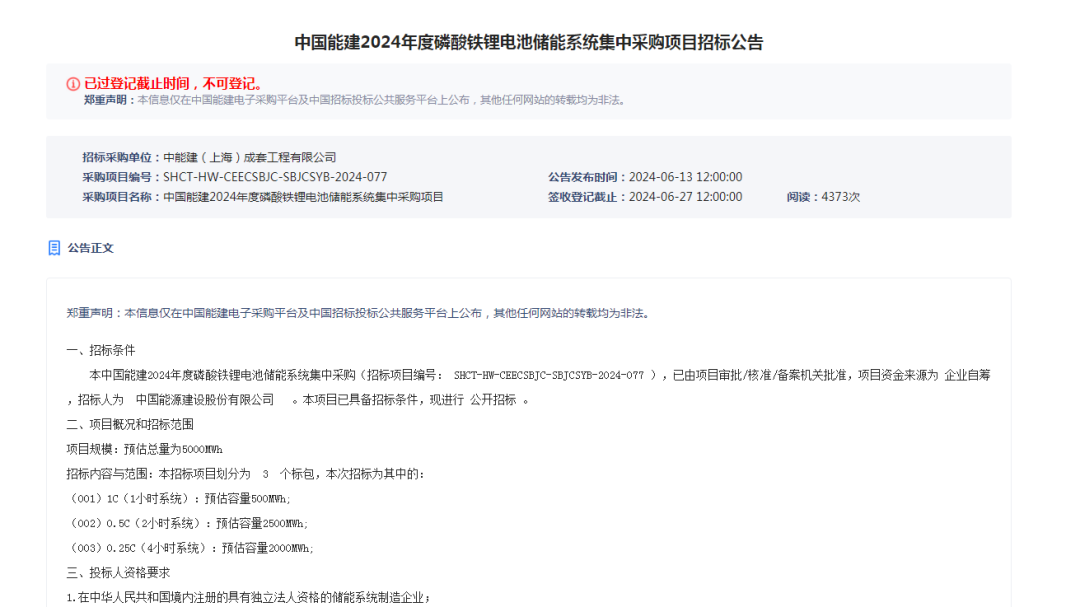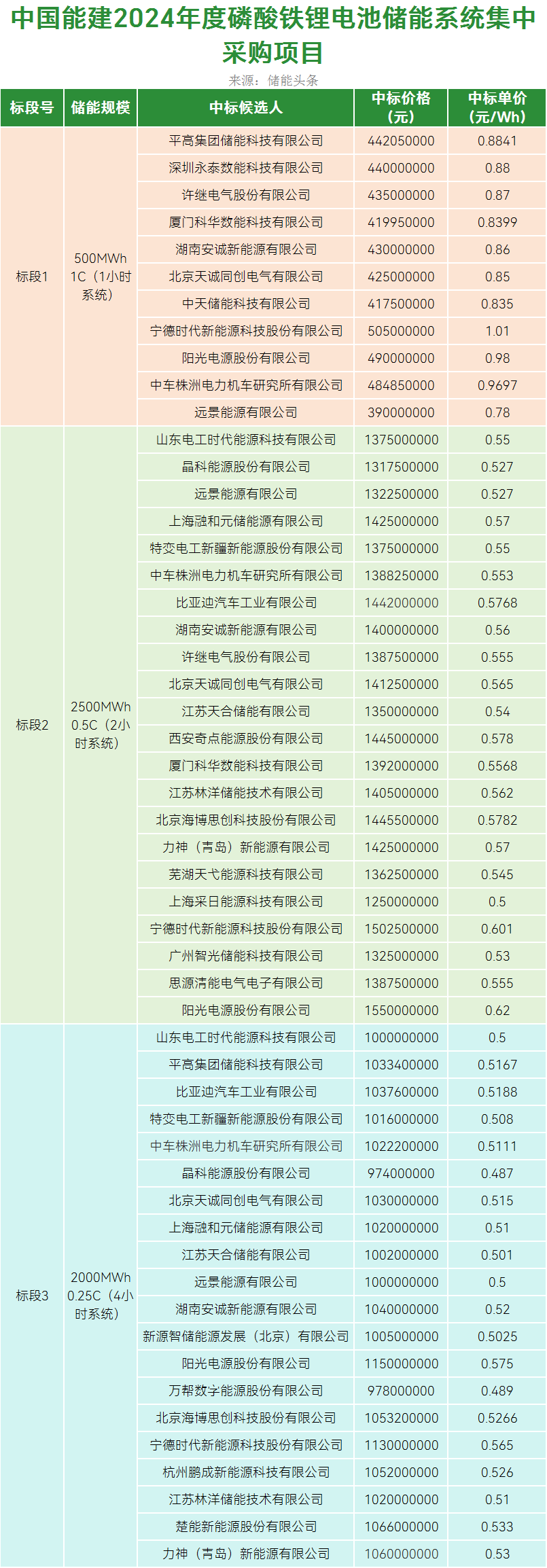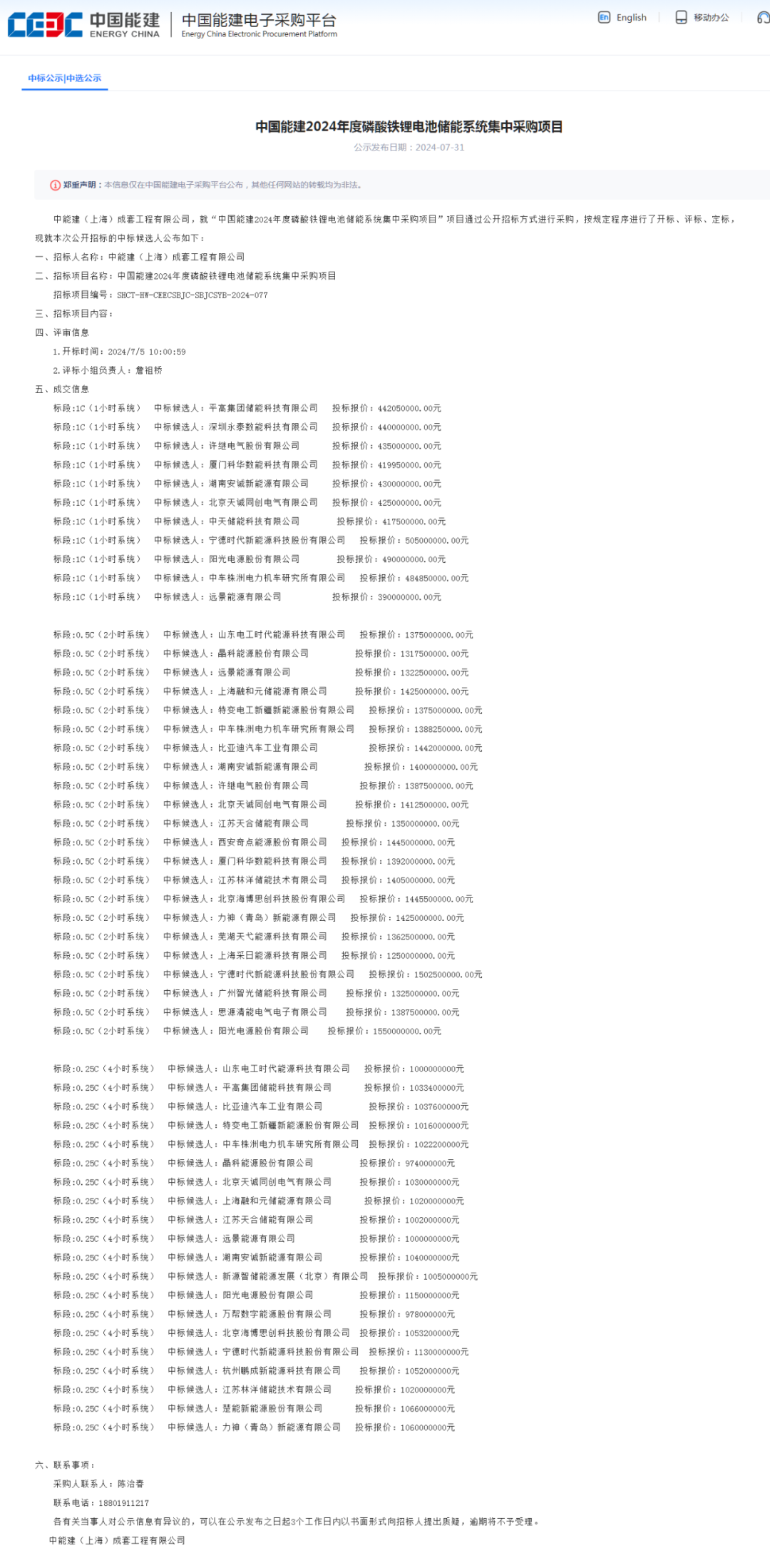 获悉,7月31日,中国能建2024年度磷酸铁锂电池储能系统集中采购项目公开招标的中标候选人公布。