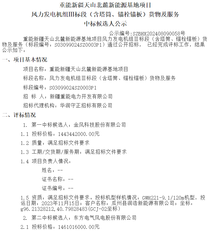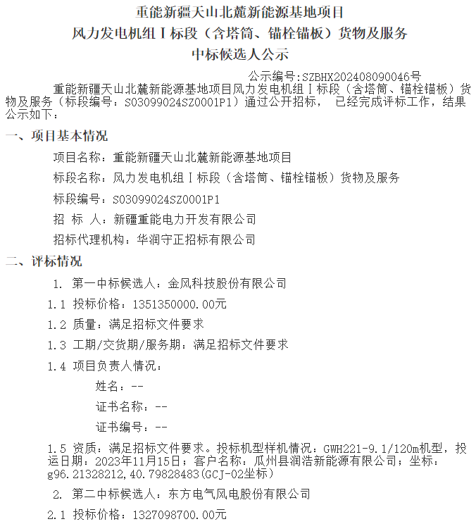 根据公示,金风科技、东方风电、中车株洲所、明阳智能作为第一中标候选人预中标。