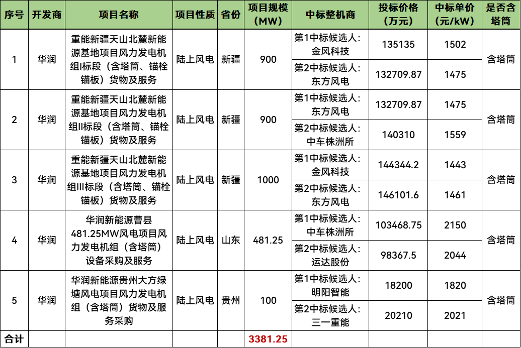 中标 | 华润3.38gw风电项目开标:金风、东方风电、中车株洲所、明阳预中标
