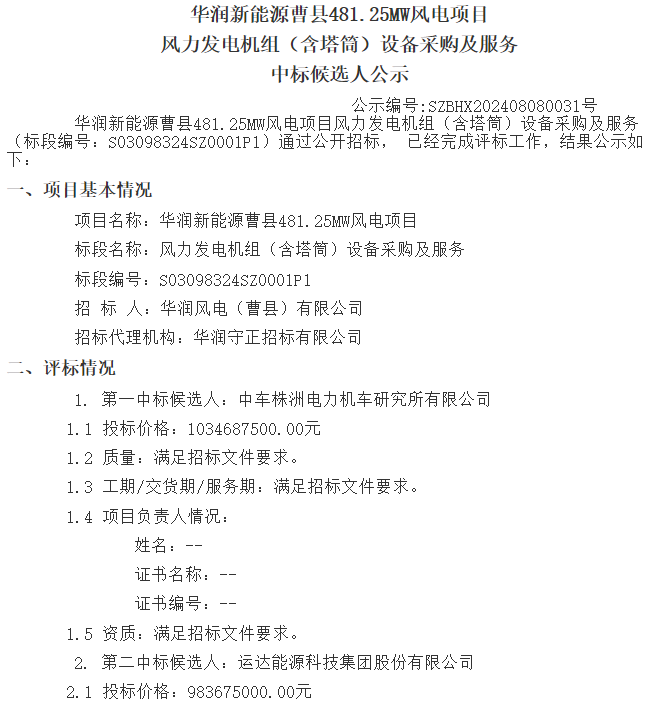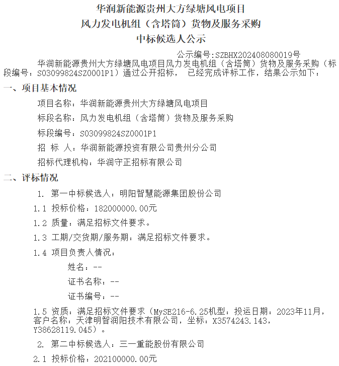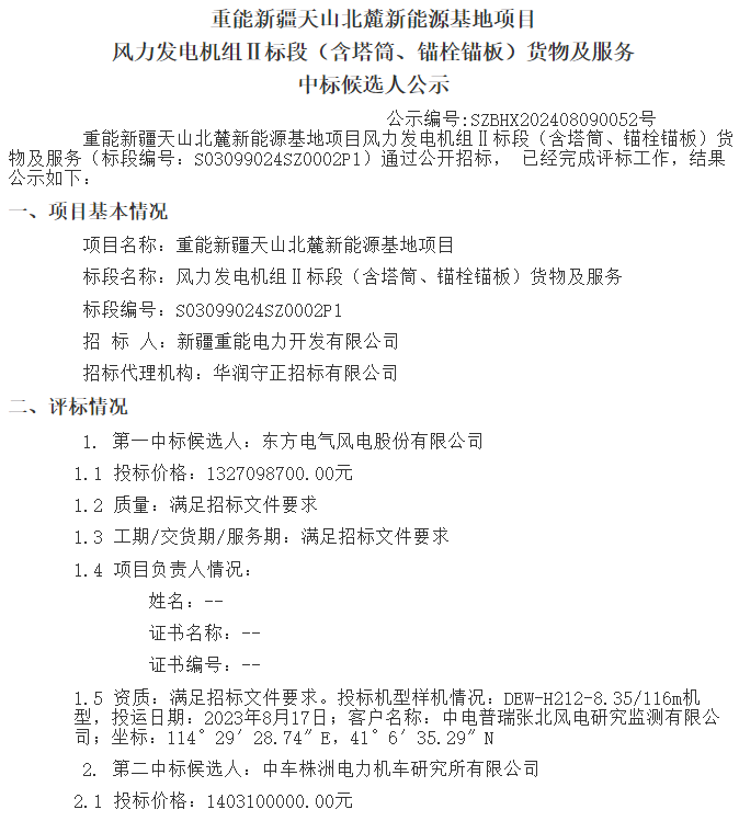 据悉,8月9日,华润集中发布重能新疆天山北麓新能源基地项目(ⅰ、ⅱ、ⅲ标段)、华润新能源曹县481.25mw风电项目、华润新能源贵州大方绿塘风电项目风力发电机组(含塔筒)货物及服务中标候选人公示,项目规模总计3381.25mw。