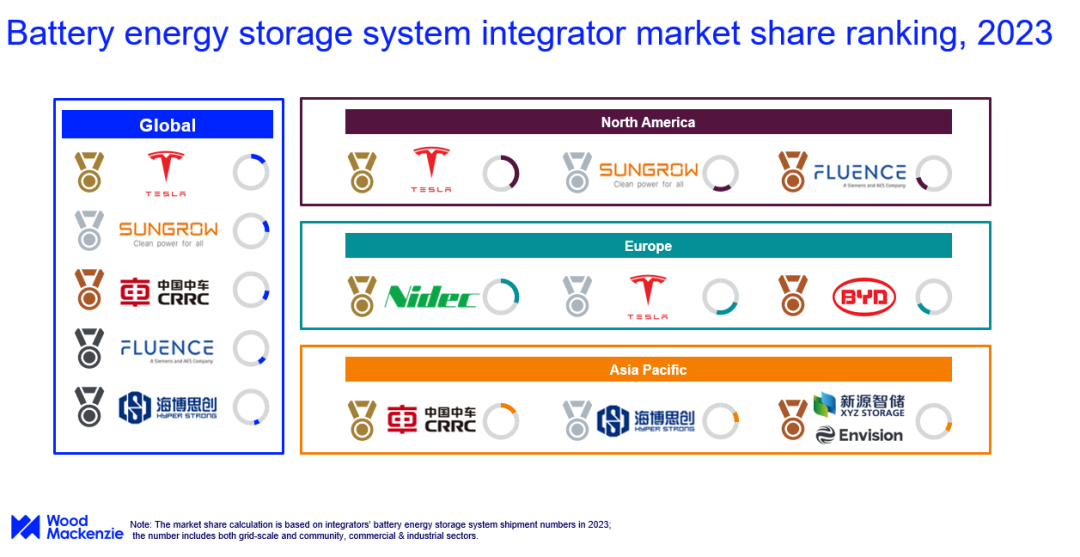 全球储能系统集成商市场集中度正在下降,这主要是由于多家中国公司进入储能市场,而中国在2023年安装了全球最多的储能系统。