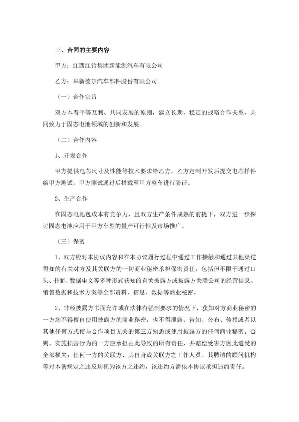 近日,德尔股份发布公告称,公司与江西江铃集团新能源汽车有限公司(以下简称“江铃新能源”)签订了《固态电池战略合作协议》。鉴于甲方在新能源汽车领域的优势和乙方在固态电池领域的技术实力,为实现双方资源共享,优势互补,共同推动固态电池的研发、生产和市场应用,双方本着平等互利、共同发展的原则,建立长期、稳定的战略合作关系,共同致力于固态电池领域的创新和发展,签订本意向协议。