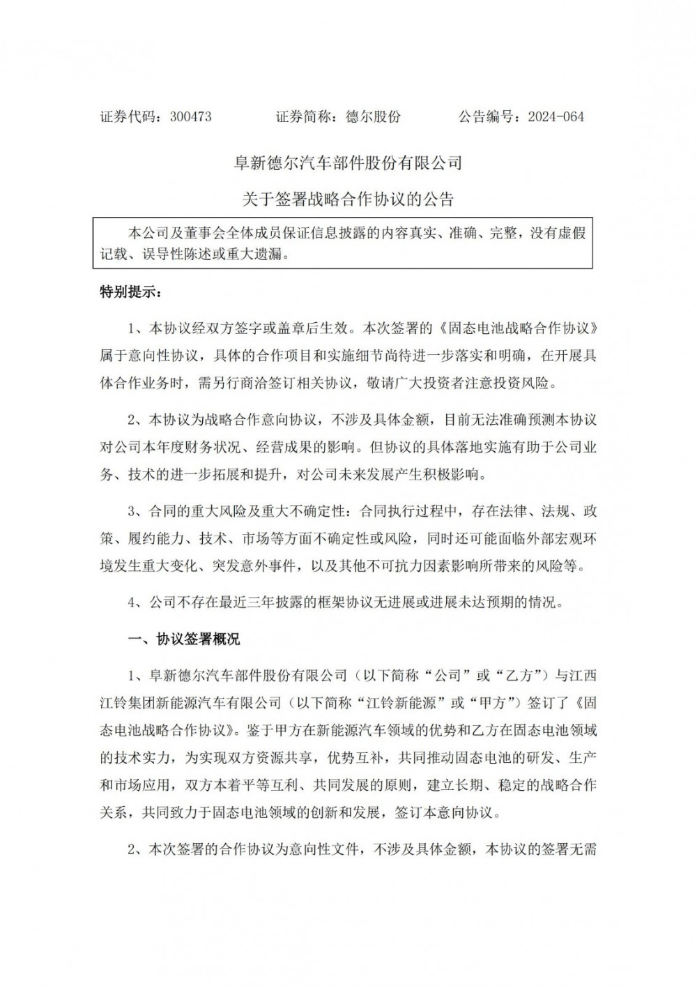 德尔股份表示,本次签署《固态电池战略合作协议》,是公司战略布局的重要体现。公司与江铃新能源达成合作关系,开展深度合作,有利于实现互惠双赢和促进公司业务发展,加速固态电池技术的成熟与普及,为消费者带来更加安全、高效、持久的绿色出行体验,增强公司整体竞争力和盈利能力,提升公司未来经营业绩,促进公司持续健康稳健发展。