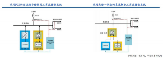 商业储能系统架构主要有两种:1)采用 pcs 的交流耦合型;2)采用光储一体机的直流耦合型。交流耦合系统与储能电站的系统配置类似,但相对用量较小,系统功能也更为简单,其中的光伏系统和储能系统并联,灵活性较高,适用于已安装工商业光伏的存量市场。直流耦合系统通过光储一体机将光伏逆变器和双向变流器整合在一起,相比交流耦合系统具有高度集成化、软性成本低的特点,50-100kw 的 光储一体机已逐渐成为中小工商业储能系统的选择。