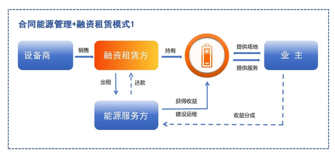 子模式1:融资租赁方根据其与能源服务方的约定从设备方处购买储能设施,并将储能设施出租给能源服务方。能源服务方利用租赁的储能设施为业主提供能源服务,获得项目收益,并与业主按约定比例分成,能源服务方再以部分收益向融资租赁方进行还款。租赁期限届满后,能源服务方获得储能设施的所有权。