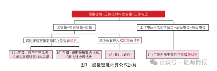 固态电池是打破现有锂电池能量密度极限的突破口,拆解能量密度,从比容量、工作电压、有效质量或体积等方面展开分析(见图1)。在其他条件不变的情况下,电荷容量越高,质量或体积越小,工作电压越高,电池能量密度越高。