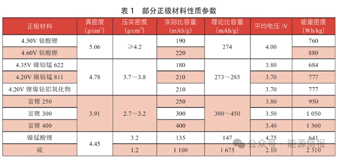 建议从三方面着手开发新型正极材料。一是开发低电位下比容量更高的正极材料,如高镍正极材料;二是提高正极材料的嵌脱锂电位,如更高电压的钴酸锂、锰酸锂和富锂锰基层状氧化物正极材料;三是开发工作电压更高的正极材料,如尖晶石型镍锰酸锂正极材料。因此,高电压钴酸锂(电压≥4.50v),更高镍含量(镍含量>0.80)或更高电压(电压≥4.35v)的镍钴锰酸锂和镍钴铝酸锂、富锂锰基正极材料以及无锂正极材料发展潜力巨大(见表1)。