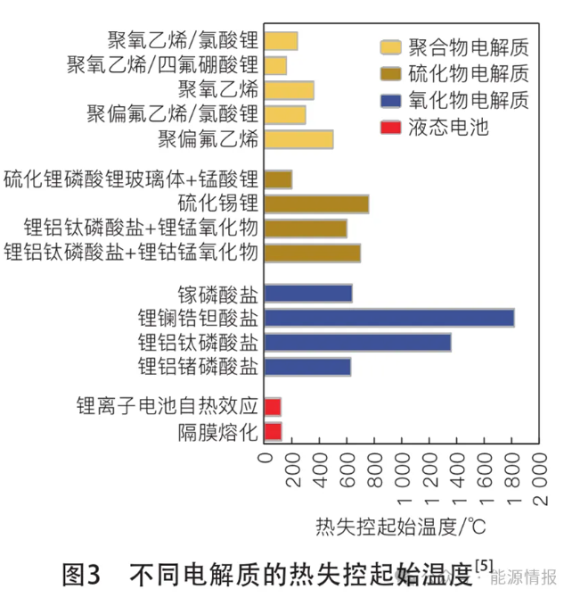 固态电解质的热失控起始温度较高(见图3),聚合物固态电解质普遍在300~400℃,硫化物在200~600℃,氧化物在600℃以上,部分可达1800℃,显著高于液态电池的200℃热失控温度。固态电解质有助于延缓或抑制热失控的发生,从而提高电池本征安全。