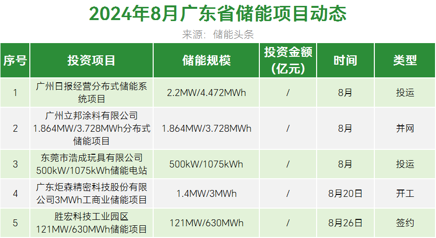 8月,广东有5个储能电站项目更新了动态。储能规模为126.964mw642.275mwh。
