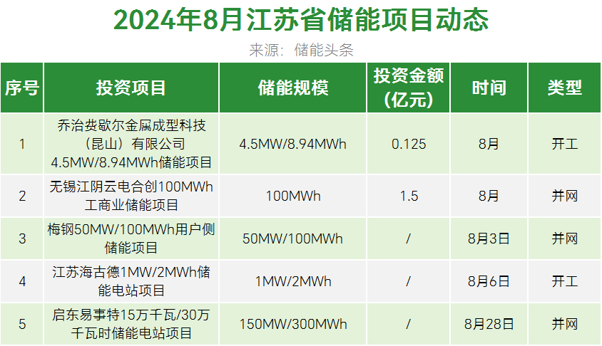 8月,江苏有5个储能电站项目更新了动态。储能规模为205.5mw510.94mwh。
