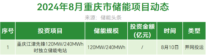 8月,重庆有1个储能电站项目更新了动态。储能规模为120mw240mwh。