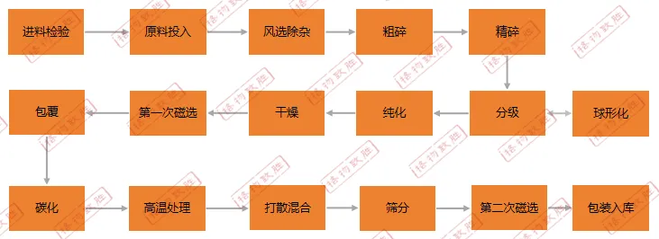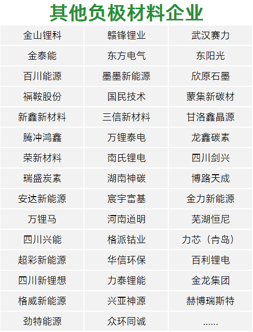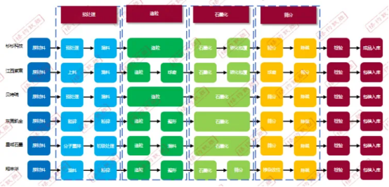 负极材料的中游为负极材料的制造加工,生产含不同种类的负极材料。