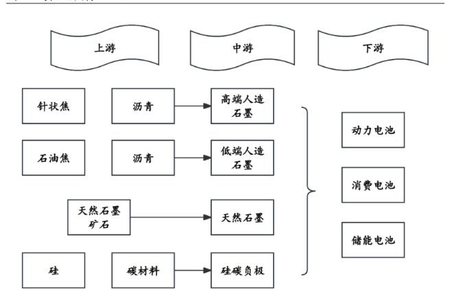 从锂电池负极材料产业链来看,上游为原材料,中游为制造加工商,下游为应用领域。