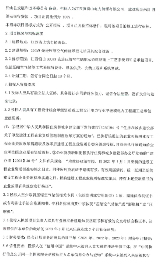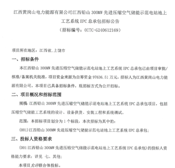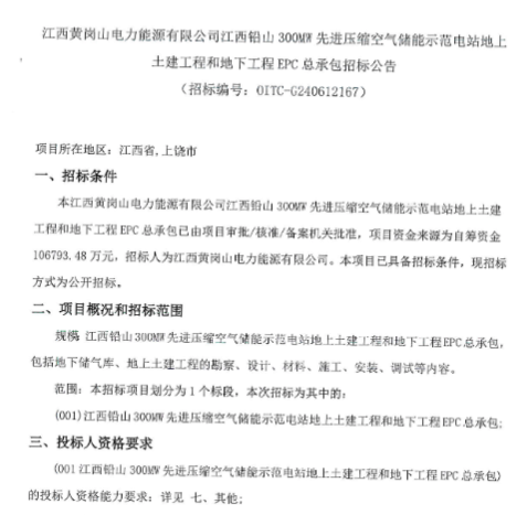 9月10日,西黄岗山电力能源有限公司江西铅山300mw先进压缩空气储能示范电站地上工艺系统、地上土建工程和地下工程epc总承包招标公告发布。