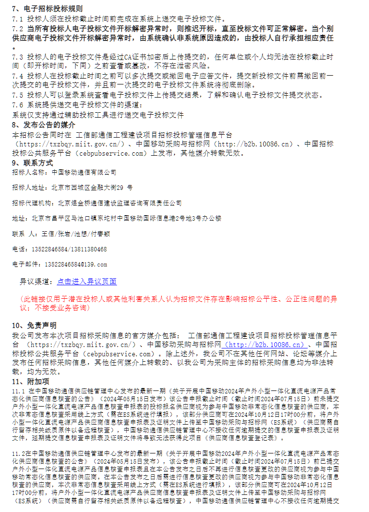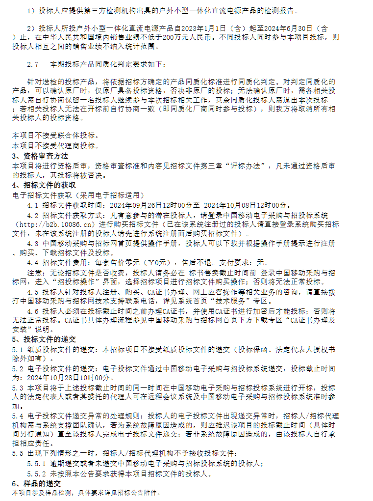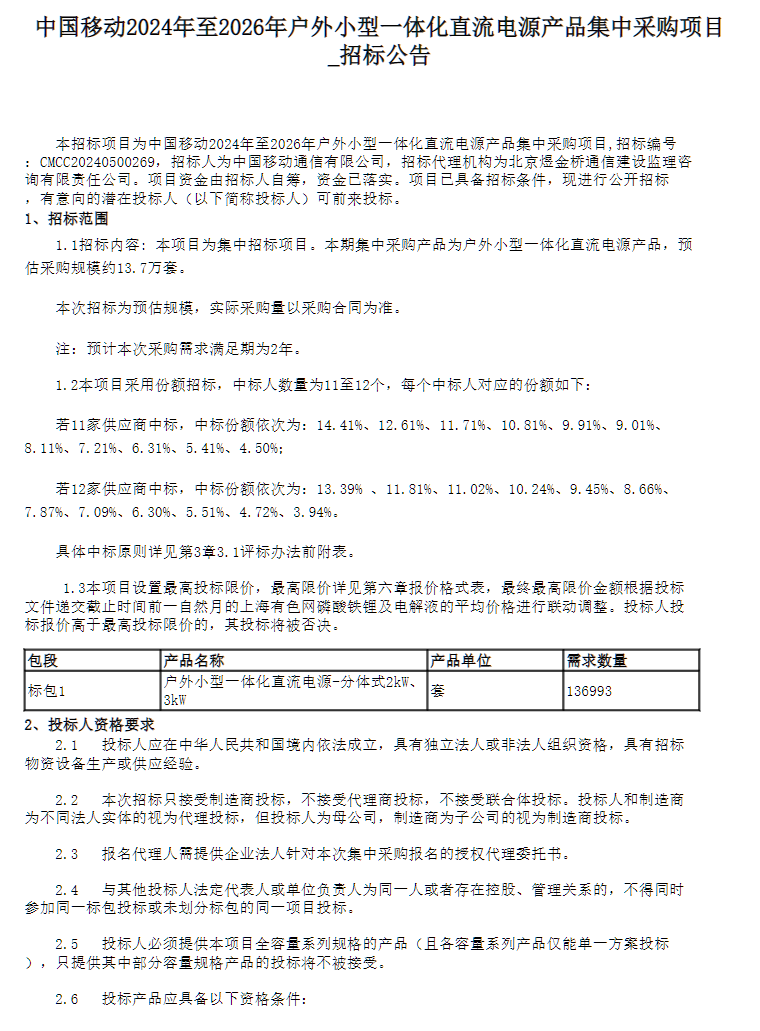 yle="text-align: left;">获悉,中国移动2024年至2026年户外小型一体化直流电源产品集中采购项目招标公告发布。