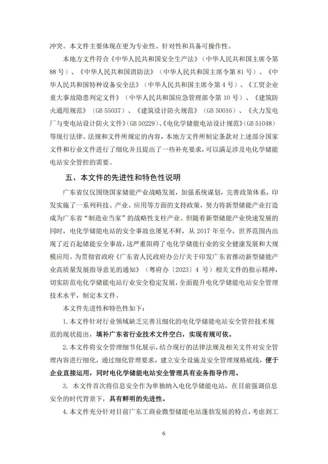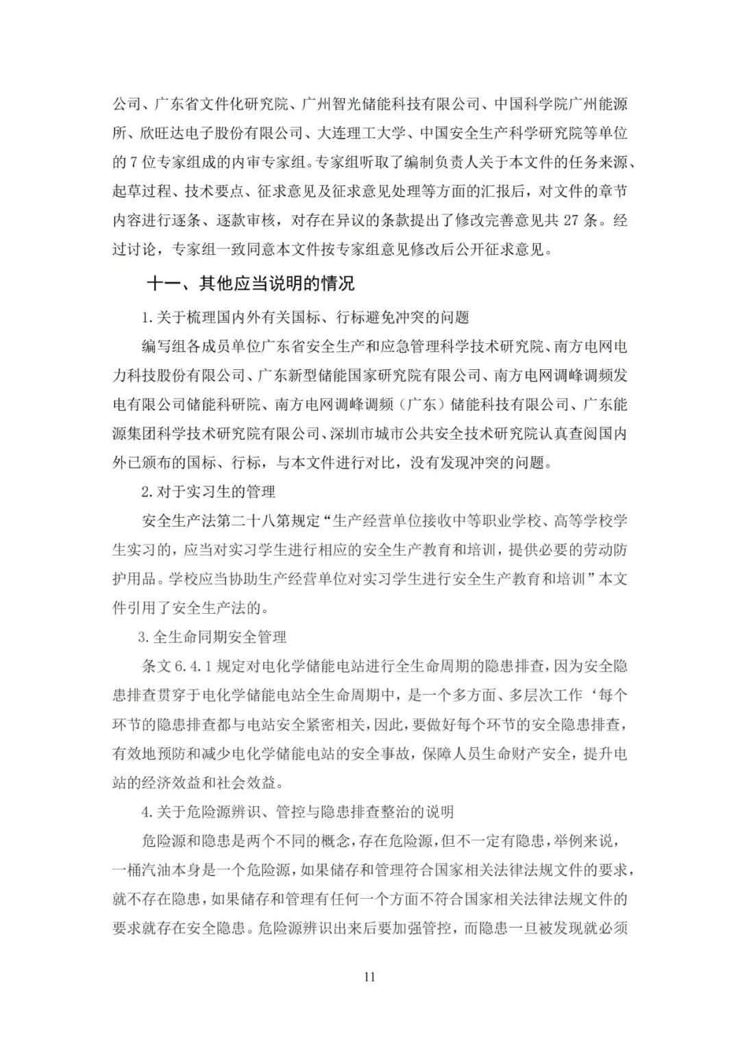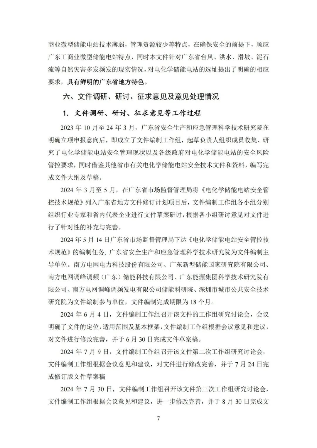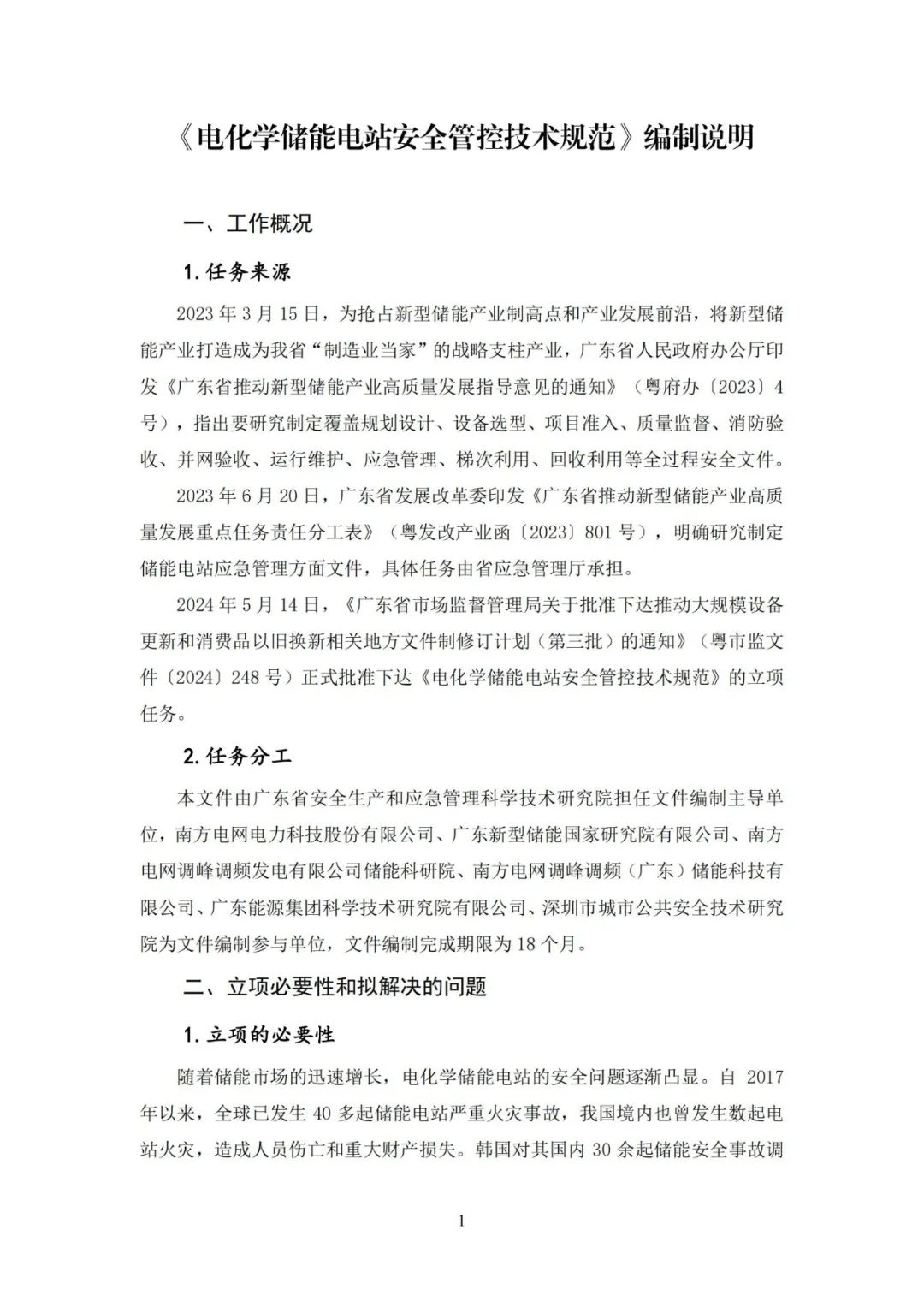 根据《广东省市场监督管理局关于批准下达推动大规模设备更新和消费品以旧换新相关地方标准制修订计划(第三批)的通知》(粤市监标准〔2024〕248号)的要求,由广东省安全生产和应急管理科学技术研究院牵头组成的标准起草小组在立项资料标准草案基础上,经过近半年的调查研究、起草讨论、单位内审,修改完善后形成了地方标准《电化学储能电站安全管控技术规范(征求意见稿)》(见附件1)。