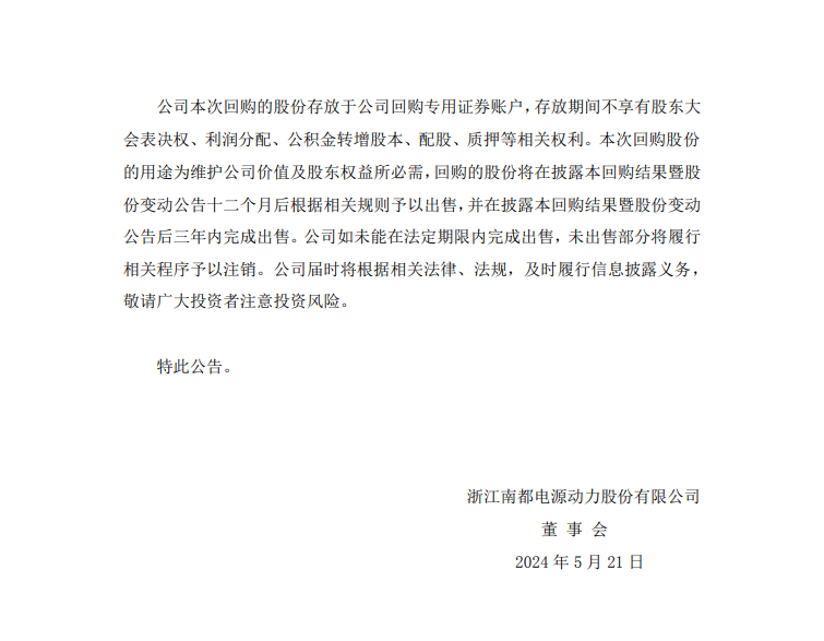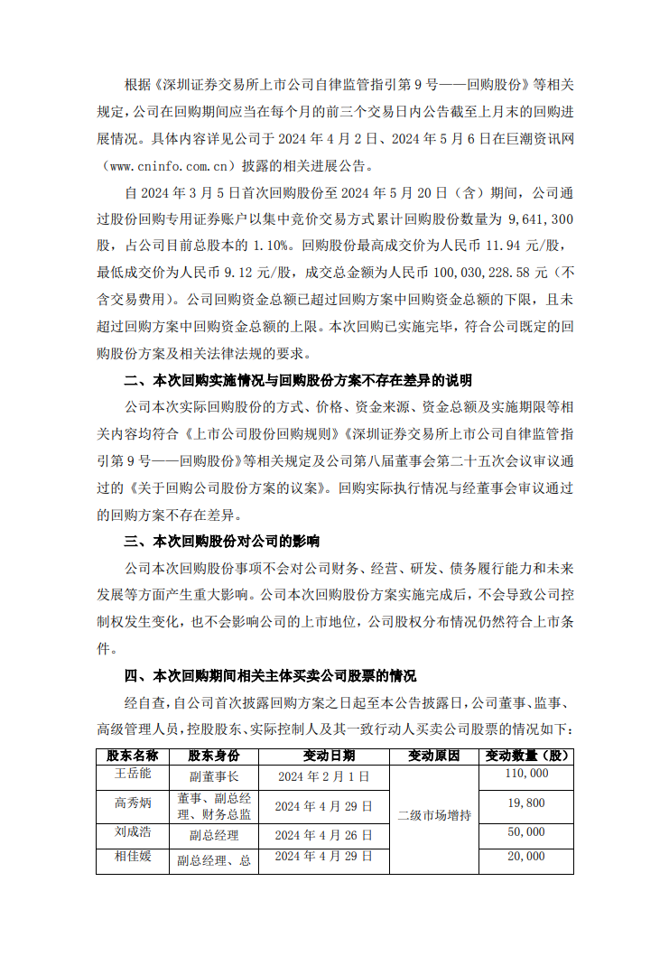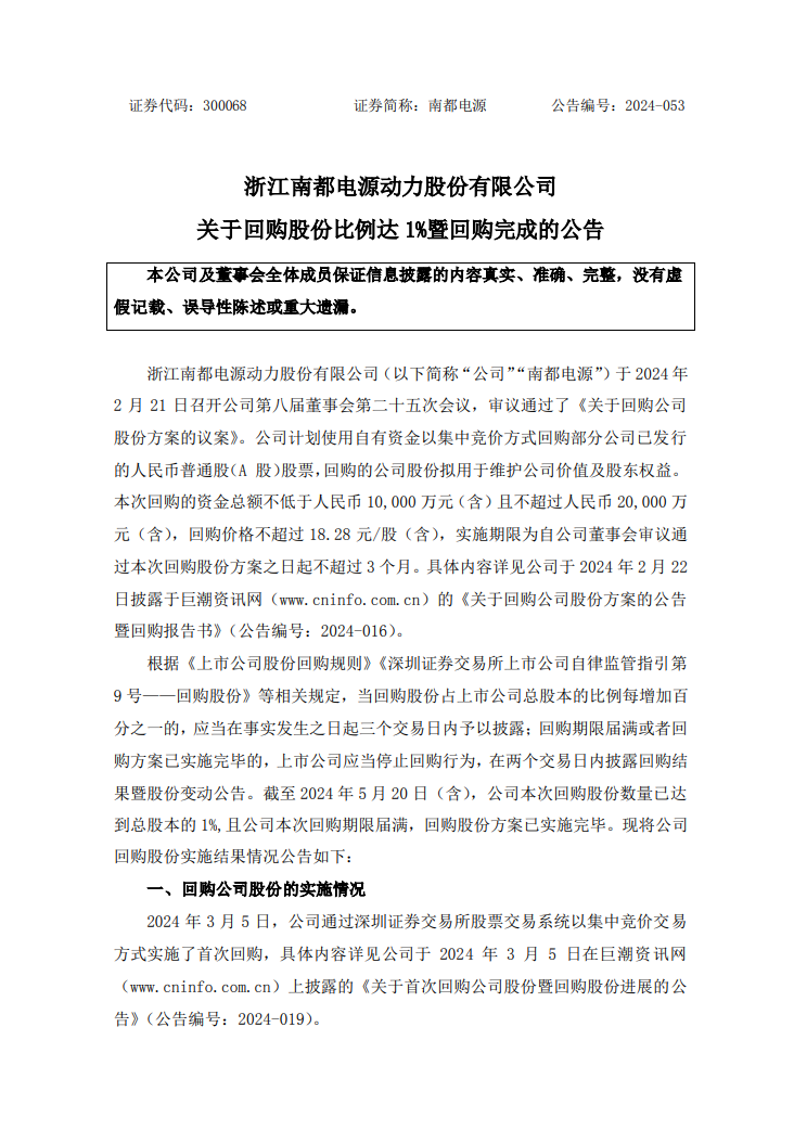 据能源圈了解到,5月21日,南都电源公告,自2024年3月5日首次回购股份至2024年5月20日(含)期间,公司通过股份回购专用证券账户以集中竞价交易方式累计回购股份数量为964.13万股,占公司目前总股本的1.10%。回购股份最高成交价为人民币11.94元/股,最低成交价为人民币9.12元/股,成交总金额为人民币1亿元(不含交易费用)。本次回购已实施完毕,符合公司既定的回购股份方案及相关法律法规的要求。