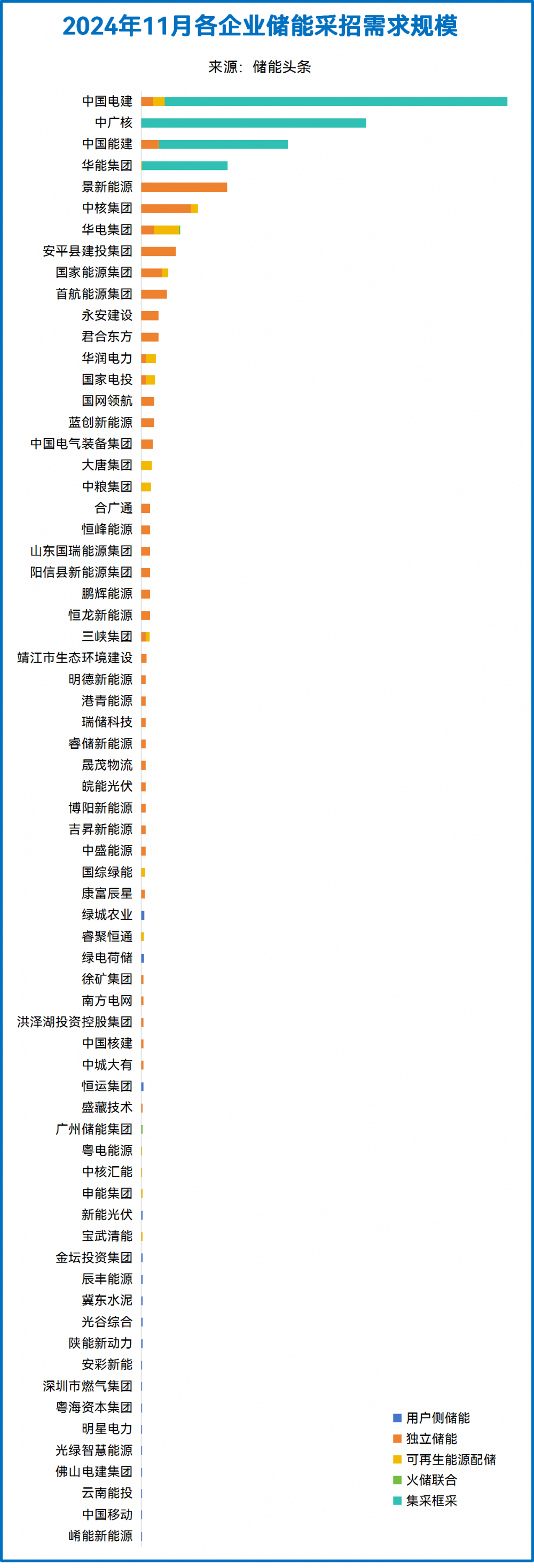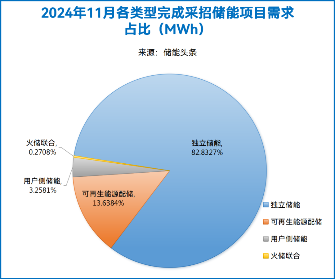 从项目类型看,11月已完成采招工作的储能项目共涉及独立式储能、可再生能源储能、用户侧储能等不同类型。