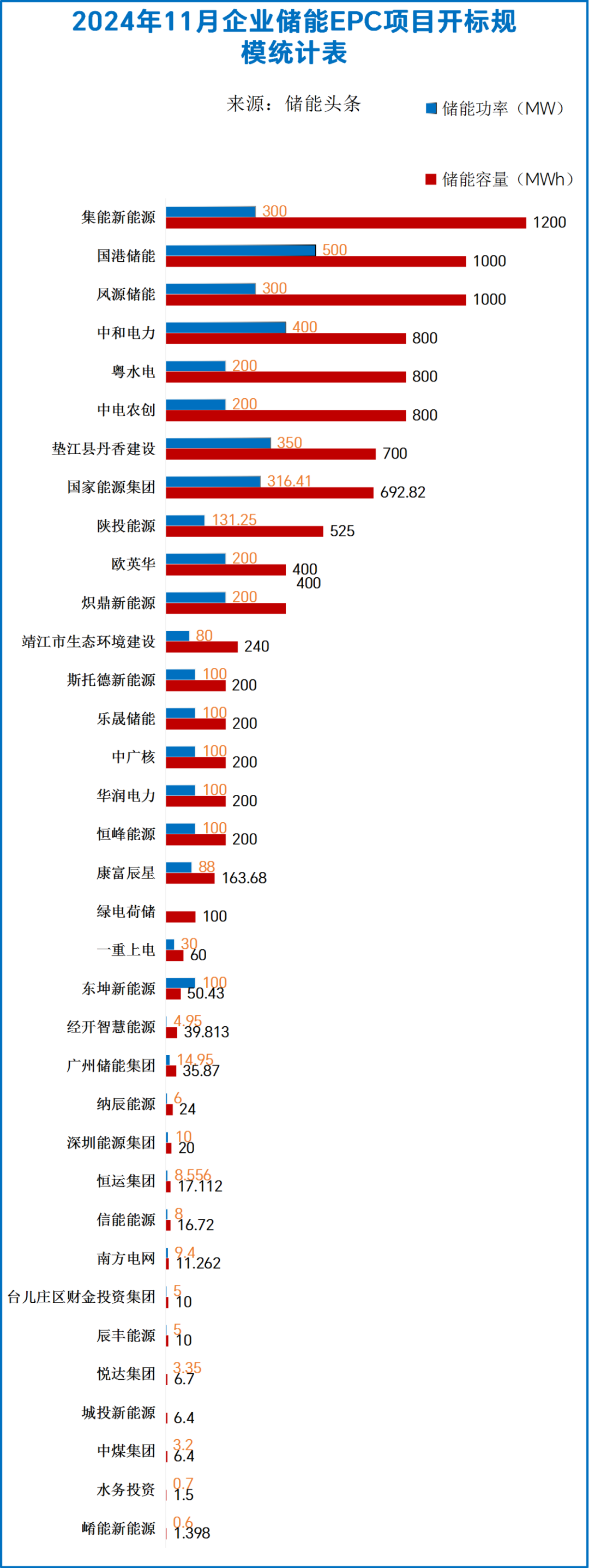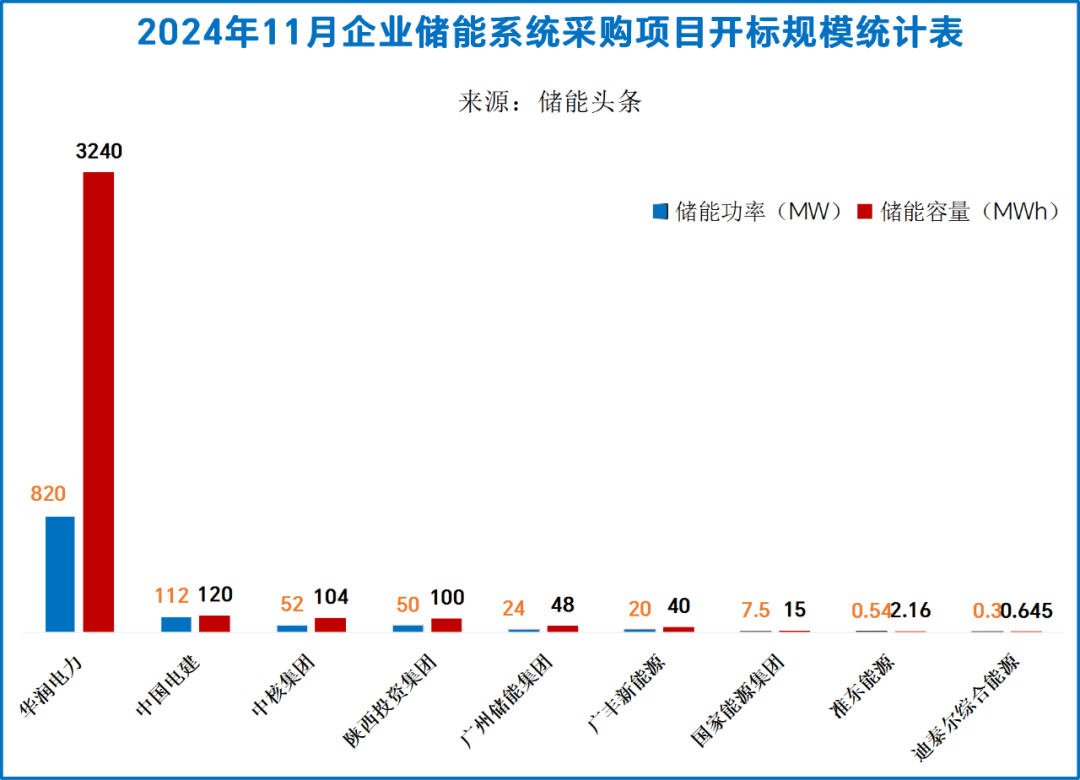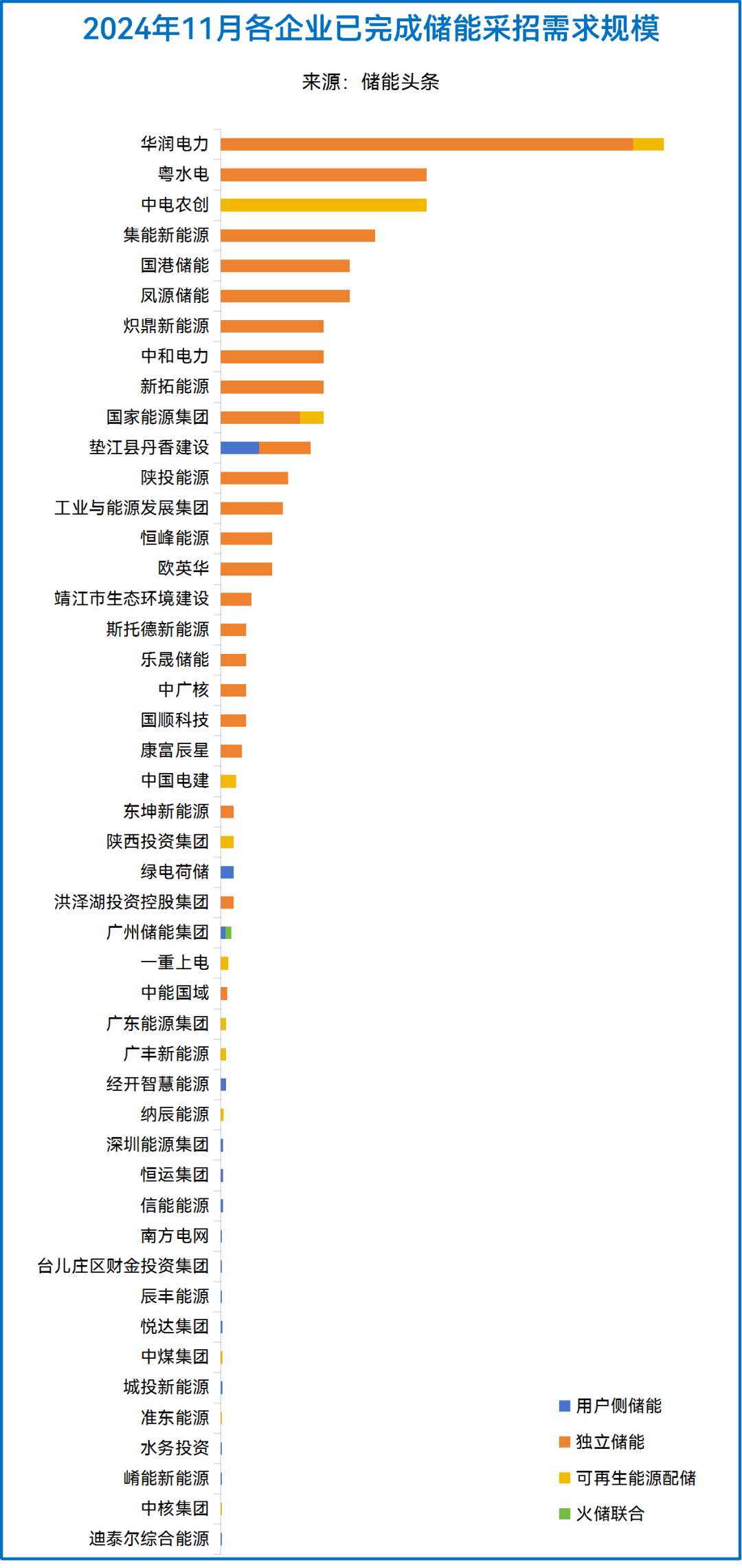 11月份,51家电站投资业主发布了储能中标结果。华润电力开标规模最大,为3440mwh,其次是粤水电和中电农创,开标规模为1600mwh。