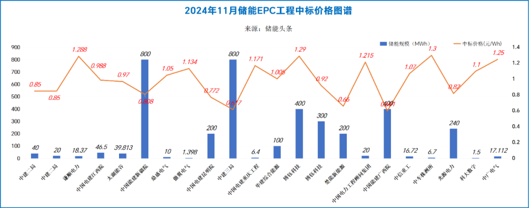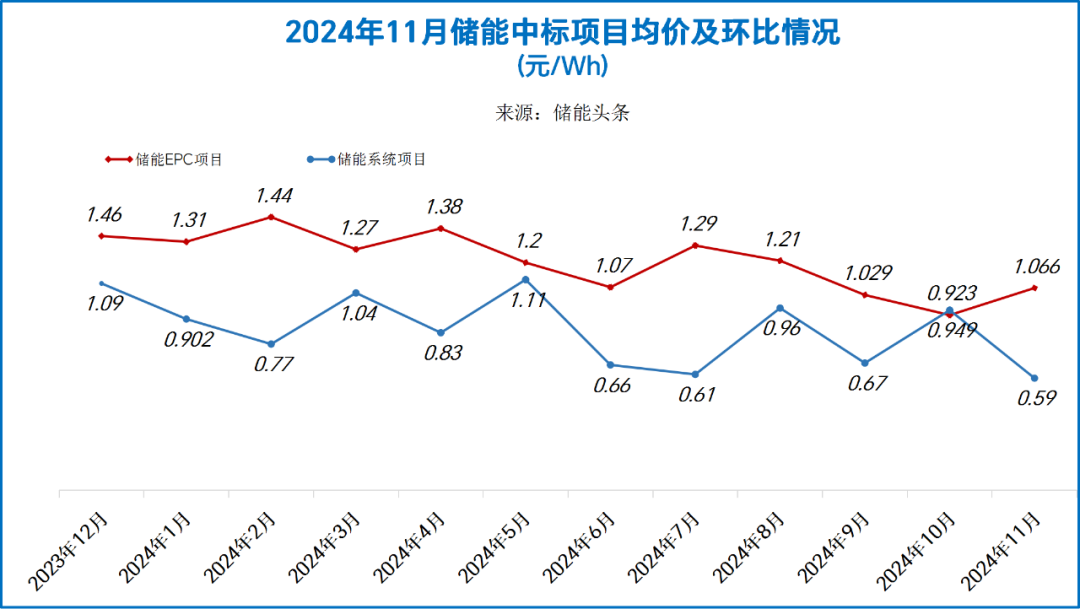 从中标结果来看,11月份储能系统采购均价在0.59元/wh左右,环比下降37%;储能epc的均价为1.066元/wh,环比上涨15%。