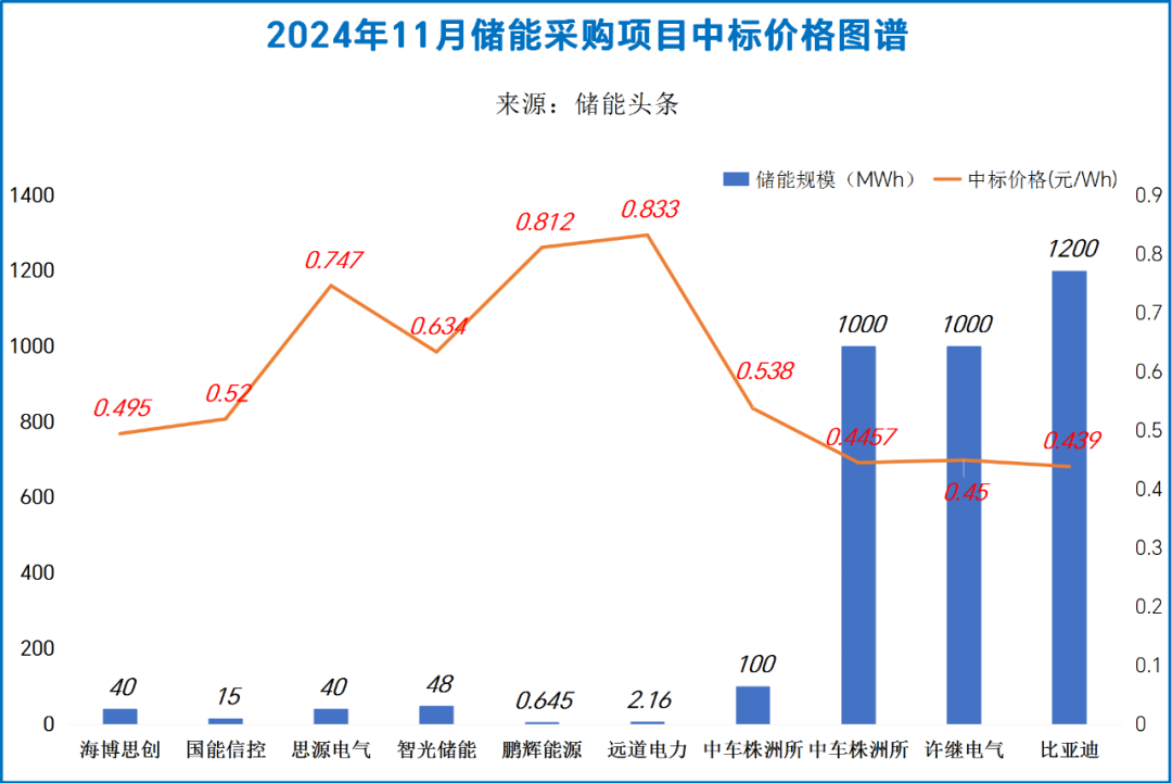 从已公布的价格来看,最高价来自新疆准东经济技术开发区新型电力服务有限公司五彩湾新城分布式光伏发电项目-储能系统设备采购,乌鲁木齐远道电力科技有限公司报价0.833元/wh,比10月最高价低2元/wh;最低价来自重能新疆天山北麓新能源基地项目250mw(1000mwh)储能系统设备及服务采购(标段三),比亚迪汽车工业有限公司报价,单价0.439元/wh。