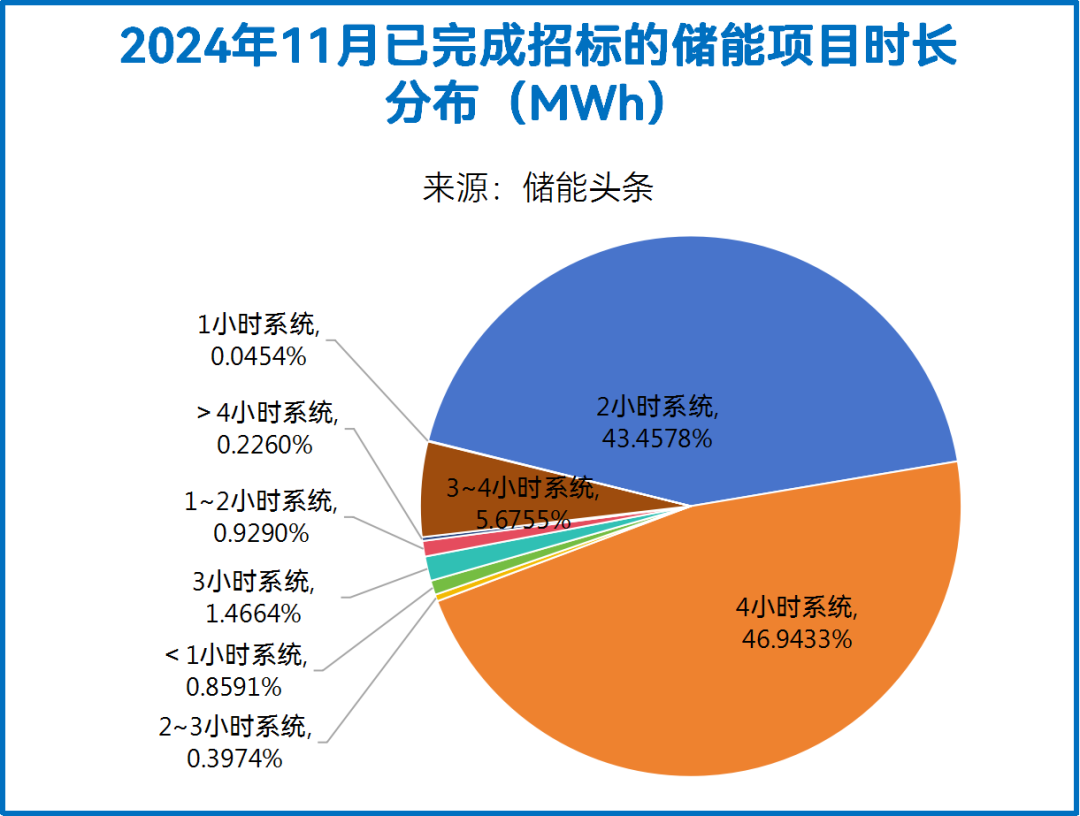 其中,11月份4小时储能时长占比超过2小时,2小时和4小时储能时长分别完成招标占比43.46%、46.94%,可见在招中标市场中,长时储能的需求越来越多。