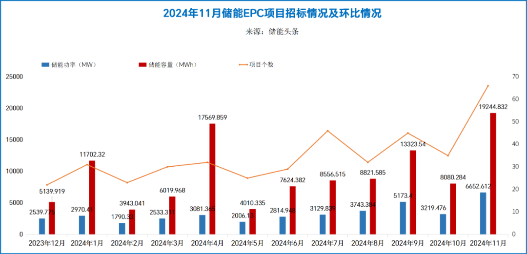 11月份国家能源集团 华电集团、南方电网、国家电投、恒运集团、首航能源集团、中国能建、安彩新能、安平县建投集团、宝武清能、博阳新能源、辰丰能源等业主发布了66个储能epc/pc(含设备)招标项目,招标规模为6652.612mw/19244.832mwh,环比上涨137.6%;