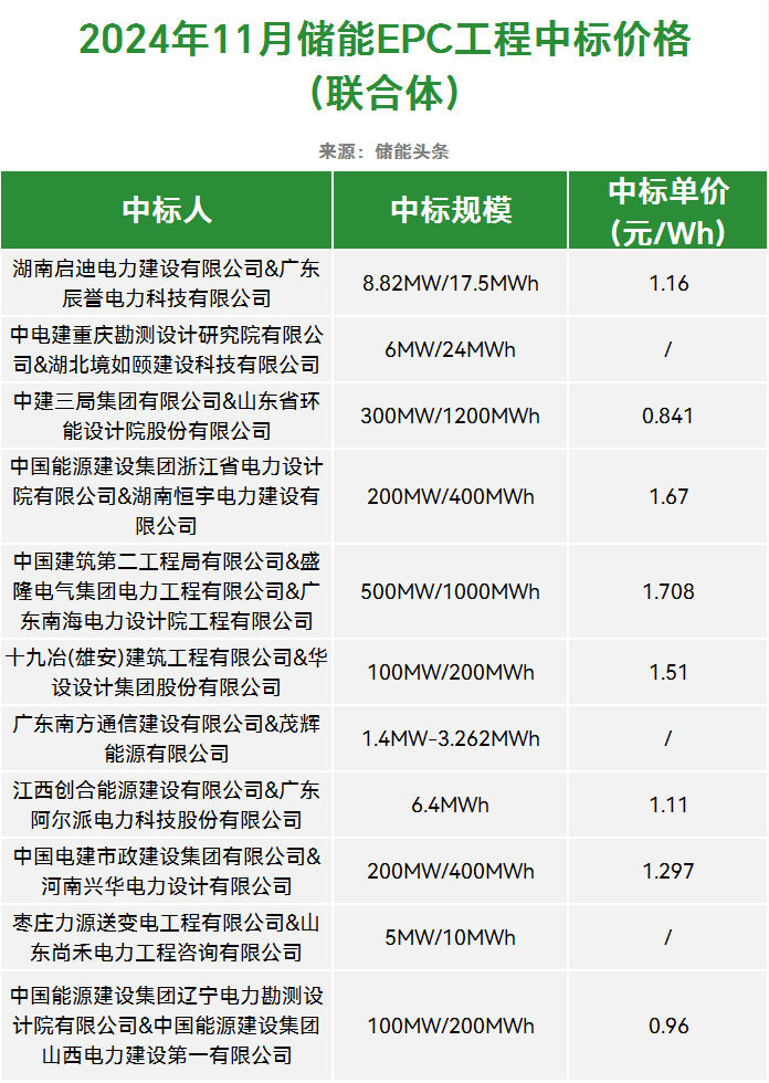储能epc中标价格在0.601~1.708元/wh之间,中标均价为1.066元/wh。最高价中标人为中国建筑第二工程局有限公司、盛隆电气集团电力工程有限公司、广东南海电力设计院工程有限公司联合体;最低价中标人为中国能源建设集团广西电力设计研究院有限公司。