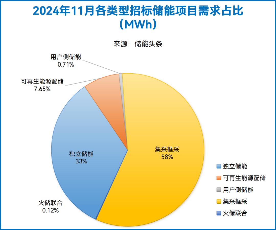 从项目类型看,11月份的储能招标项目共涉及集采框采、独立式储能、可再生能源储能、用户侧储能等不同类型。