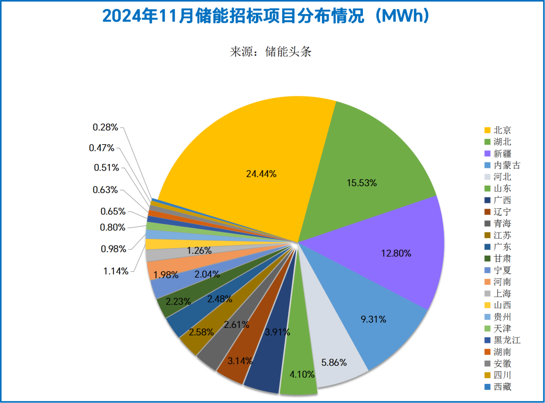 从地区来看,11月份储能招标项目主要集中在北京、湖北、新疆三地。北京储能招标规模达10.5gwh,领跑全国,容量规模占全国建设地点明确招标项目的24.44%;新疆11月共286mw/6672mwh储能项目发布了招标公告,容量占比15.53%,11月新疆、内蒙古、河北、山东、广西、辽宁、青海、江苏、广东9省份储能招标规模都在1gwh以上。