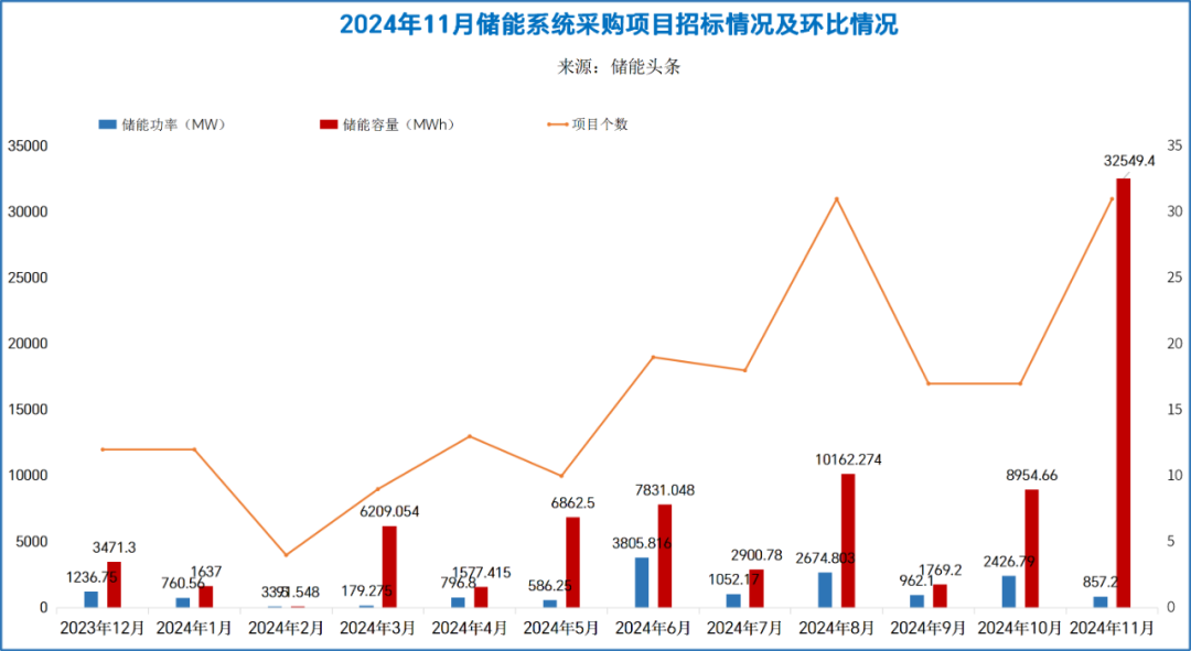 其中,11月份中广核、中国电建、三峡集团、中粮集团、国家电投、国综绿能、华能集团等业主发布了31个储能采购招标项目,招标规模为32549.4mw/32549.4mwh,环比上涨263.3%;