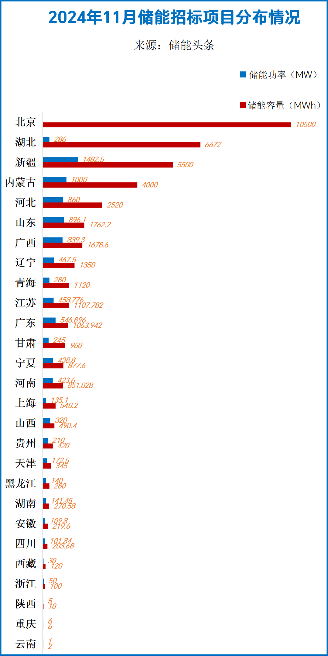 从招标来看,11月份根据公开信息统计了125个储能招标项目,其中epc(含设备)、pc、储能系统(含直流侧)采购、电芯采购、容量租赁等招标达10147.162mw/62970.612mwh,招标需求规模创历史新高。
