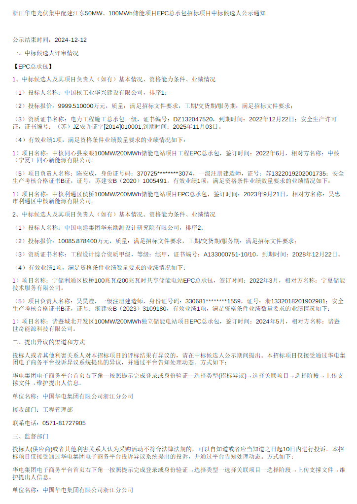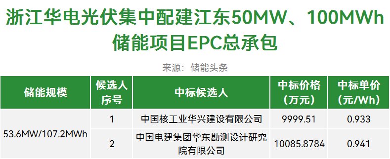 第一中标候选人为中国核工业华兴建设有限公司,投标报价9999.51万元,折合单价0.933元/wh;第二中标候选人为中国电建集团华东勘测设计研究院有限公司,投标报价10085.8784万元,折合单价0.941元/wh。