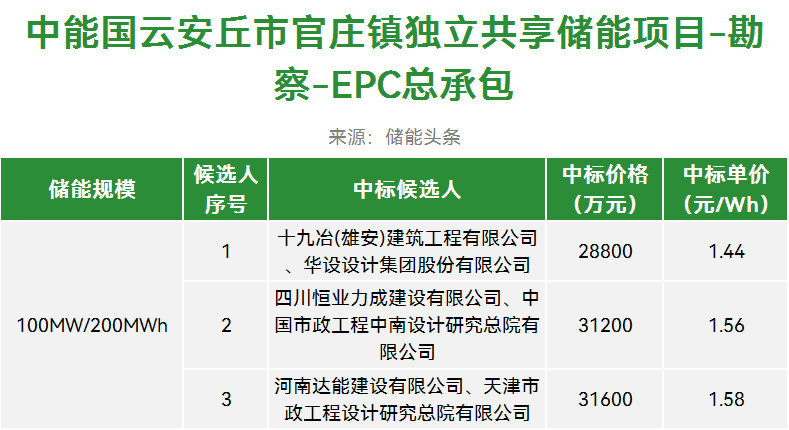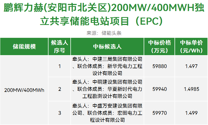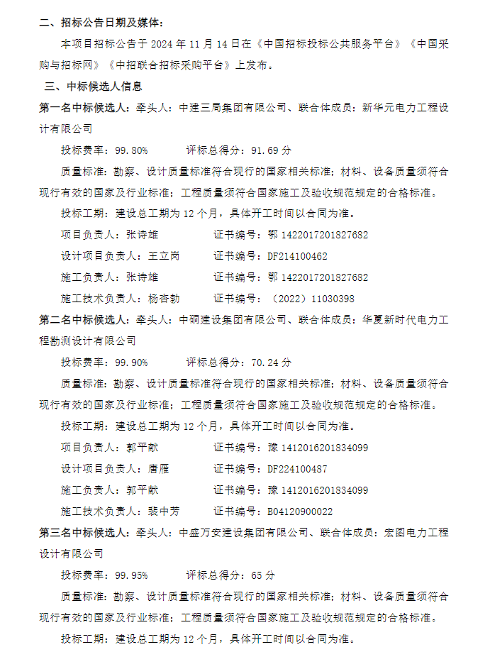 第一中标候选人为中建三局集团有限公司、新华元电力工程设计有限公司联合体,投标报价59880万元,折合单价1.497元/wh;第二中标候选人为中硐建设集团有限公司、华夏新时代电力工程勘测设计有限公司联合体,投标报价59940万元,折合单价1.4985元/wh;第三中标候选人为中盛万安建设集团有限公司、宏图电力工程设计有限公司联合体,投标报价59970万元,折合单价1.499元/wh。