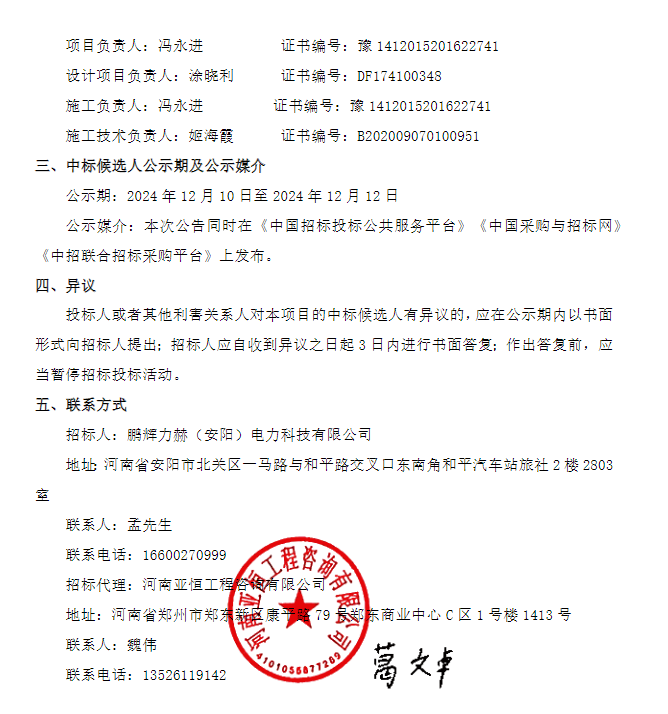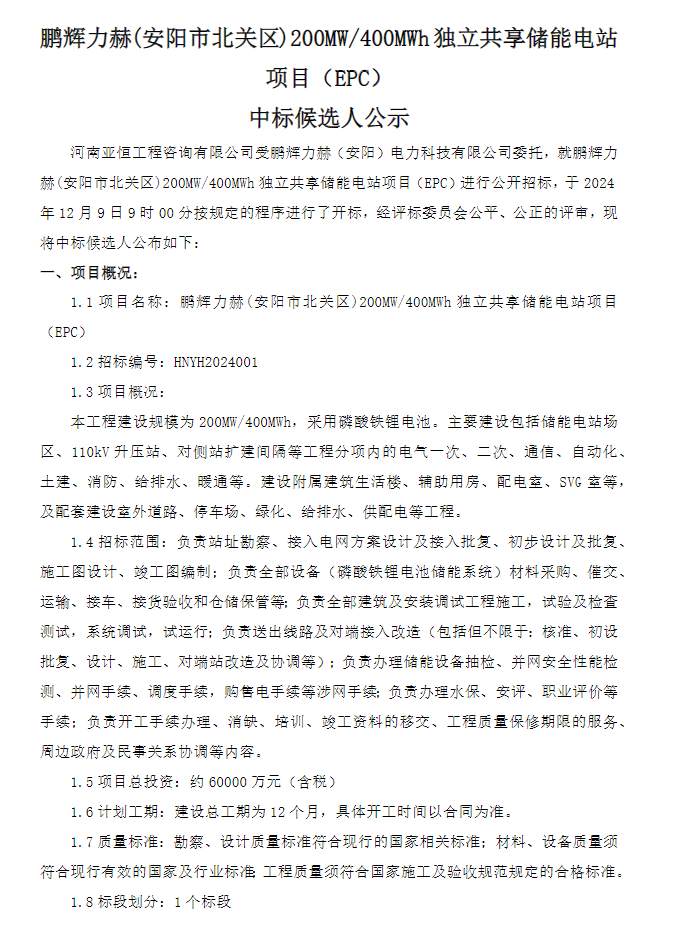 项目招标人为鹏辉力赫(安阳)电力科技有限公司,本工程位于河南省安阳市,建设规模为 200mw/400mwh,采用磷酸铁锂电池。主要建设包括储能电站场区110kv 升压站、对侧站扩建间隔等工程分项内的电气一次、二次、通信、自动化、土建、消防、给排水、暖通等。建设附属建筑生活楼、辅助用房、配电室、svg 室等,及配套建设室外道路、停车场、绿化、给排水、供配电等工程。