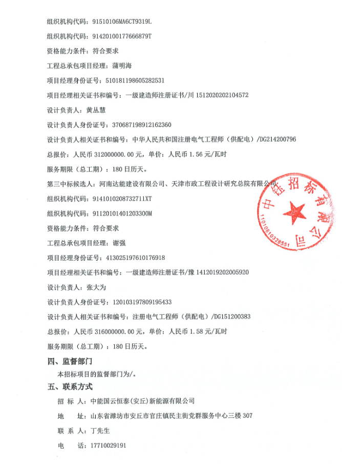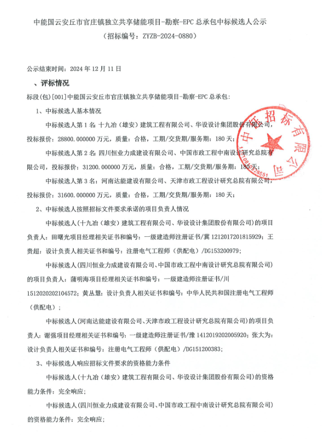第一中标候选人为十九冶(雄安)建筑工程有限公司、华设设计集团股有限公司联合体,投标报价28800万元,折合单价1.44元/wh;第二中标候选人为四川恒业力成建设有限公司、中国市政工程中南设开究总院有限公司联合体,投标报价31200万元,折合单价1.56元/wh;第三中标候选人为河南达能建设有限公司、天津市政工程设计研究总院有限公司联合体,投标报价31600万元,折合单价1.58元/wh。