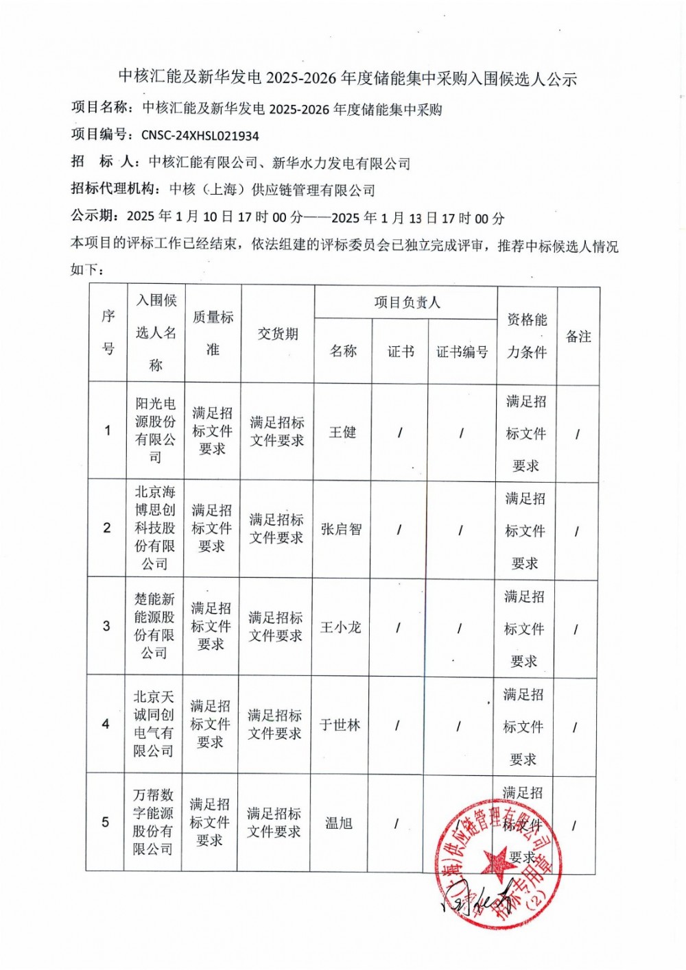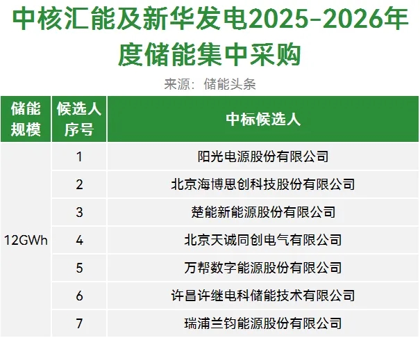 获悉,近日,中核汇能及新华发电2025-2026年度储能集中采购中标候选人公示。集中采购框架有效期至2026年5月31日。