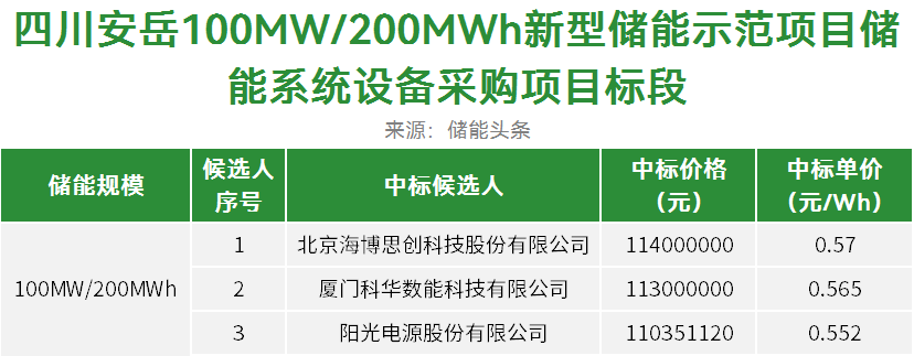结果显示,第一中标候选人为北京海博思创科技股份有限公司,投标报价为114000000元,投标单价约为0.57元/wh。第二中标候选人为厦门科华数能科技有限公司,投标报价为113000000元,投标单价约为0.565元/wh。第三中标候选人为阳光电源股份有限公司,投标报价为110351120元,投标单价约为0.552元/wh。