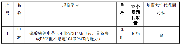 标段二:磷酸铁锂电芯(不限定314ah电芯,具备集成pack但不限定104串pack的能力)招标规模是1gwh
