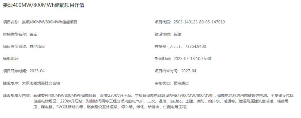 3月18日,山西省投资项目在线审批监管平台山西省工程建设项目审批管理系统信息显示,娄烦400mw/800mwh储能项目备案预审通过。