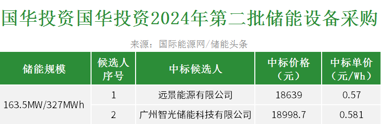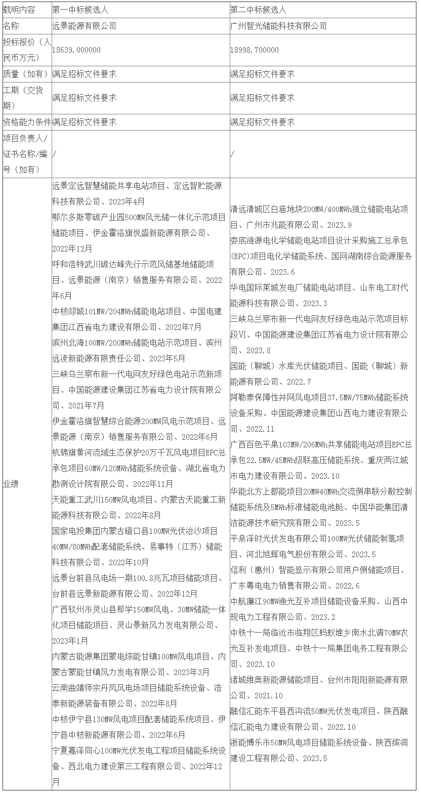第一中标候选人为远景能源有限公司,投标报价18639万元,折合单价0.57元/wh;第二中标候选人为广州智光储能科技有限公司,投标报价18998.7万元,折合单价0.581元/wh。
