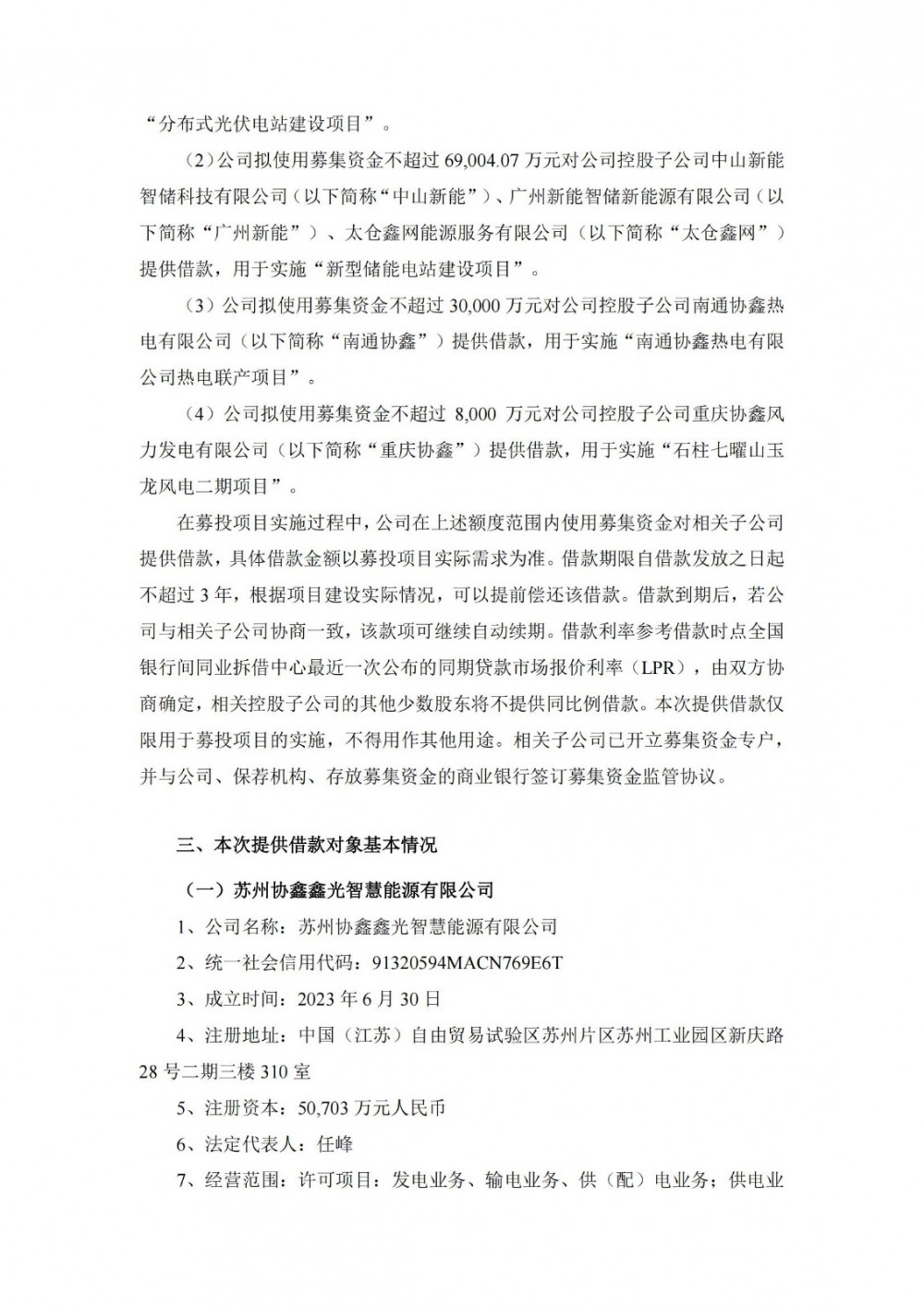 其中,协鑫能科拟使用募集资金不超过69,004.07万元对公司控股子公司中山新能智储科技有限公司(以下简称“中山新能”)、广州新能智储新能源有限公司(以下简称“广州新能”)、太仓鑫网能源服务有限公司(以下简称“太仓鑫网”)提供借款,用于实施“新型储能电站建设项目”。