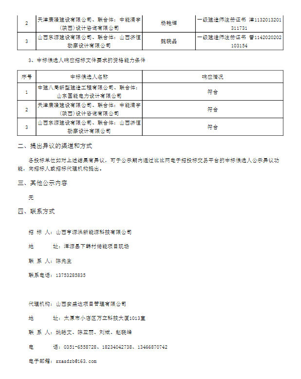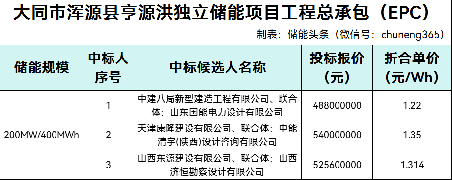 第一中标候选人为中建八局新型建造工程有限公司、联合体:山东国能电力设计有限公司,投标报价488000000元,折合单价1.22元/wh;第二中标候选人为天津康隆建设有限公司、联合体:中能清宇(陕西)设计咨询有限公司,投标报价540000000元,折合单价1.35元/wh;第三中标候选人为山西东源建设有限公司、联合体:山西济恒勘察设计有限公司,投标报价525600000元,折合单价1.314元/wh。