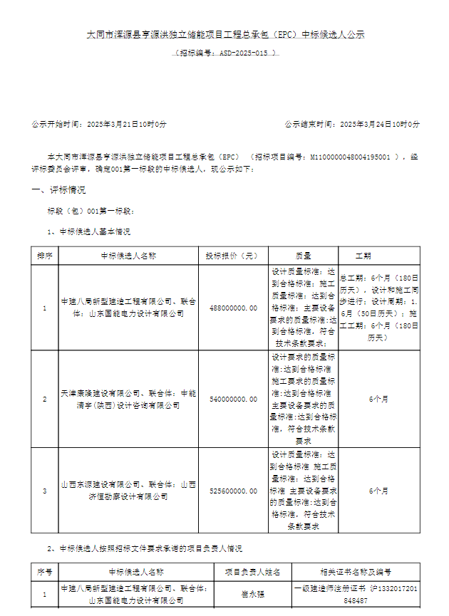 获悉,3月21日,大同市浑源县亨源洪独立储能项目工程总承包(epc)中标候选人公示。
