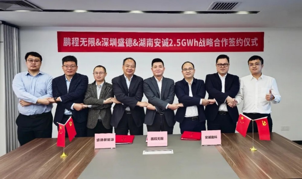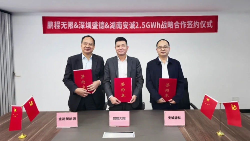 近日,鹏程无限与深圳盛德新能源科技有限公司(以下简称“盛德新能源”)、湖南安诚新能源有限公司(以下简称“安诚能科”)签署战略协议,三方将围绕2.5gwh储能设备展开合作。