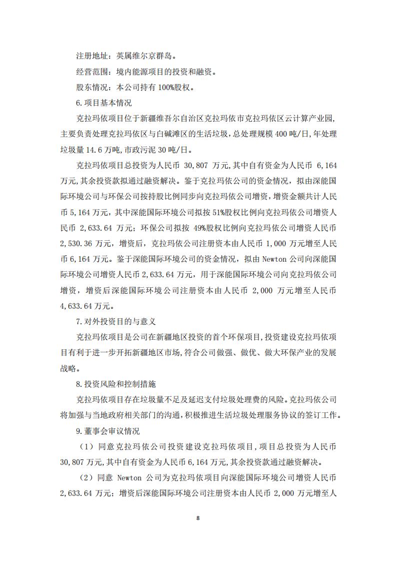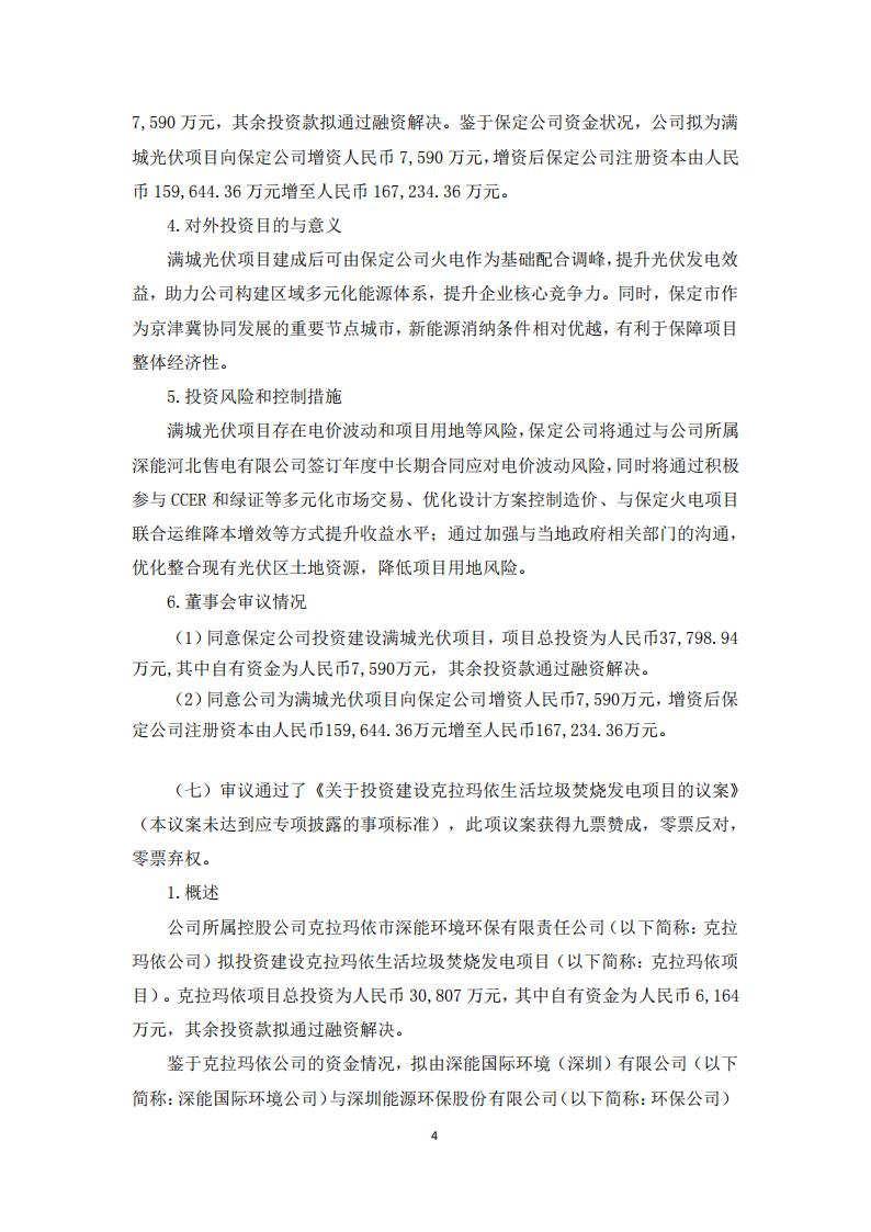 全资子公司深能保定发电有限公司拟投资建设深能满城10万千瓦光伏发电项目(以下简称:满城光伏项目)。满城光伏项目总投资为人民币37,798.94万元,其中自有资金为人民币7,590万元,其余投资款拟通过融资解决。