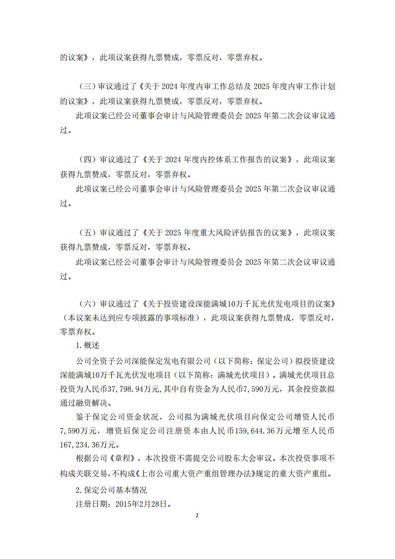 公告显示,深圳能源董事会审议通过关于投资建设深能满城10万千瓦光伏发电项目的议案。