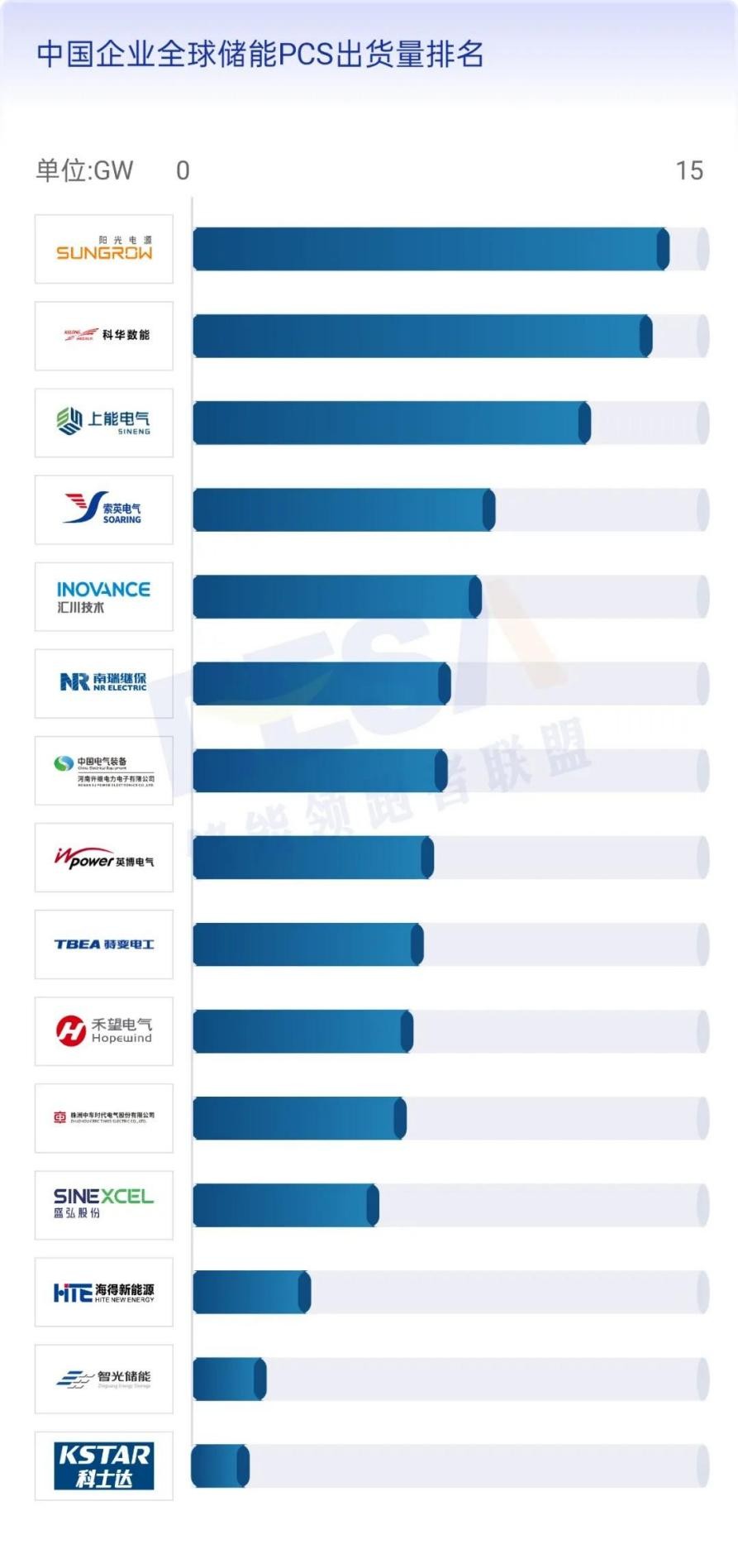 2024年度,在中国企业全球储能pcs出货量排名中,出货量排名前十五的中国储能企业依次为:阳光电源、科华数能、上能电气、索英电气、汇川技术、南瑞继保、许继电力电子公司、英博电气、特变电工、禾望电气、中车时代电气、盛弘股份、海得新能源、智光储能、kstar科士达。