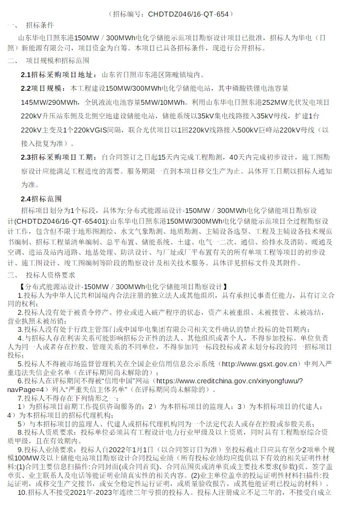 4月1日,山东华电日照东港150mw/300mwh电化学储能示范项目勘察设计招标公告发布。