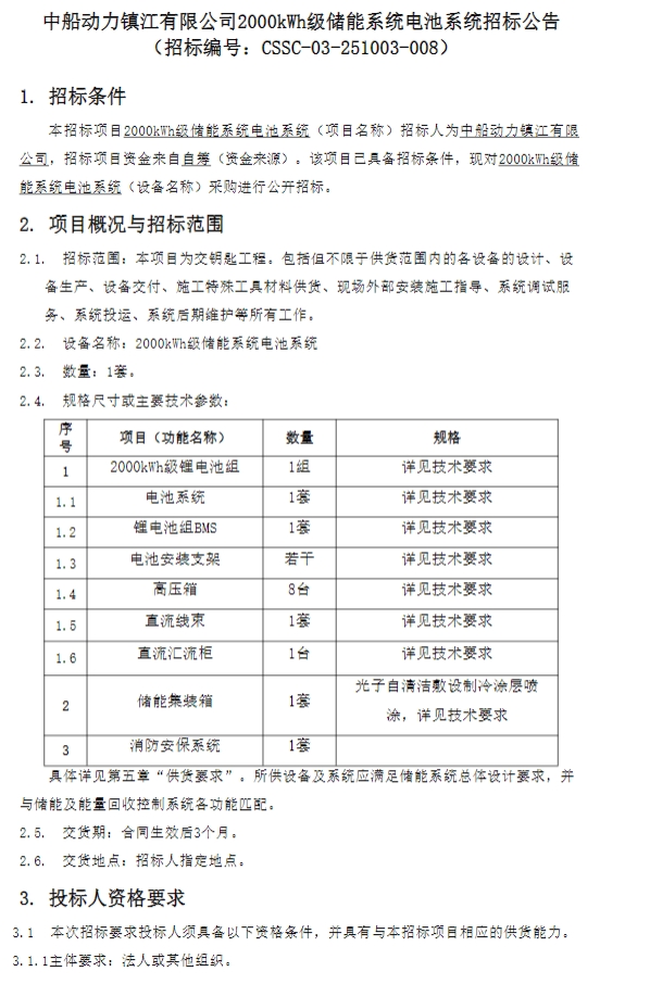 4月1日,中船动力镇江有限公司2000kwh级储能系统电池系统招标公告发布。